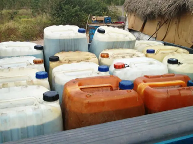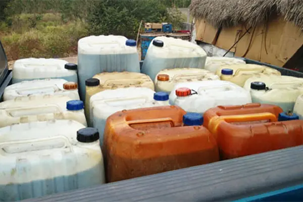 En el lugar detuvieron a dos sujetos y aseguraron veinte mil quinientos pesos, una caja de cartón conteniendo en su interior 27 cartuchos calibre .22; 17 Bidones de plástico con capacidad de 50 litros aproximadamente llenos en su totalidad de un líquido con las características del hidrocarburo conocido como diésel, dos embudos metálicos, dos mangueras de color transparente amarillentas, y una camioneta.