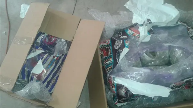 En dicho establecimiento encontraron tres cajas de cartón de diferente tamaño conteniendo en total 32 paquetes de material sintético transparente conteniendo vegetal verde y seco al parecer Mariguana, con un peso bruto aproximado a 20 kilos 500 gramos.
