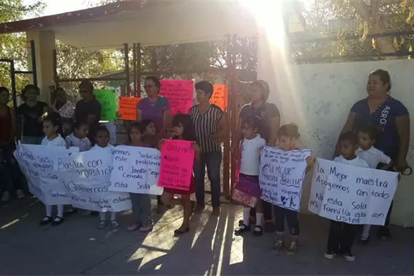 Familiares y maestros tomaron el kínder Héroes de la Revolución ubicado en el Poblado 7, en el Valle del Carrizo, municipio de Ahome en apoyo a una maestra que no le reconocen las evaluaciones que ha hecho en la nueva reforma educativa.