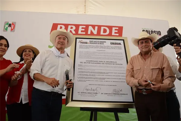 Al final el candidato Quirino Ordaz y Oswaldo Chazaro Montalvo presidente de la Confederación Nacional de Organizaciones Ganaderas, así como Faustino Hernández Álvarez, presidente de la Unión Regional Ganadera, firmaron los compromisos, y comprometieron a los la senadora Diva Hadamira Gastélum, junto a los diputados federales; David López Gutiérrez, Gloria Himelda Félix Niebla, Evelio Plata Inzunza, a que también firmaran el compromiso.