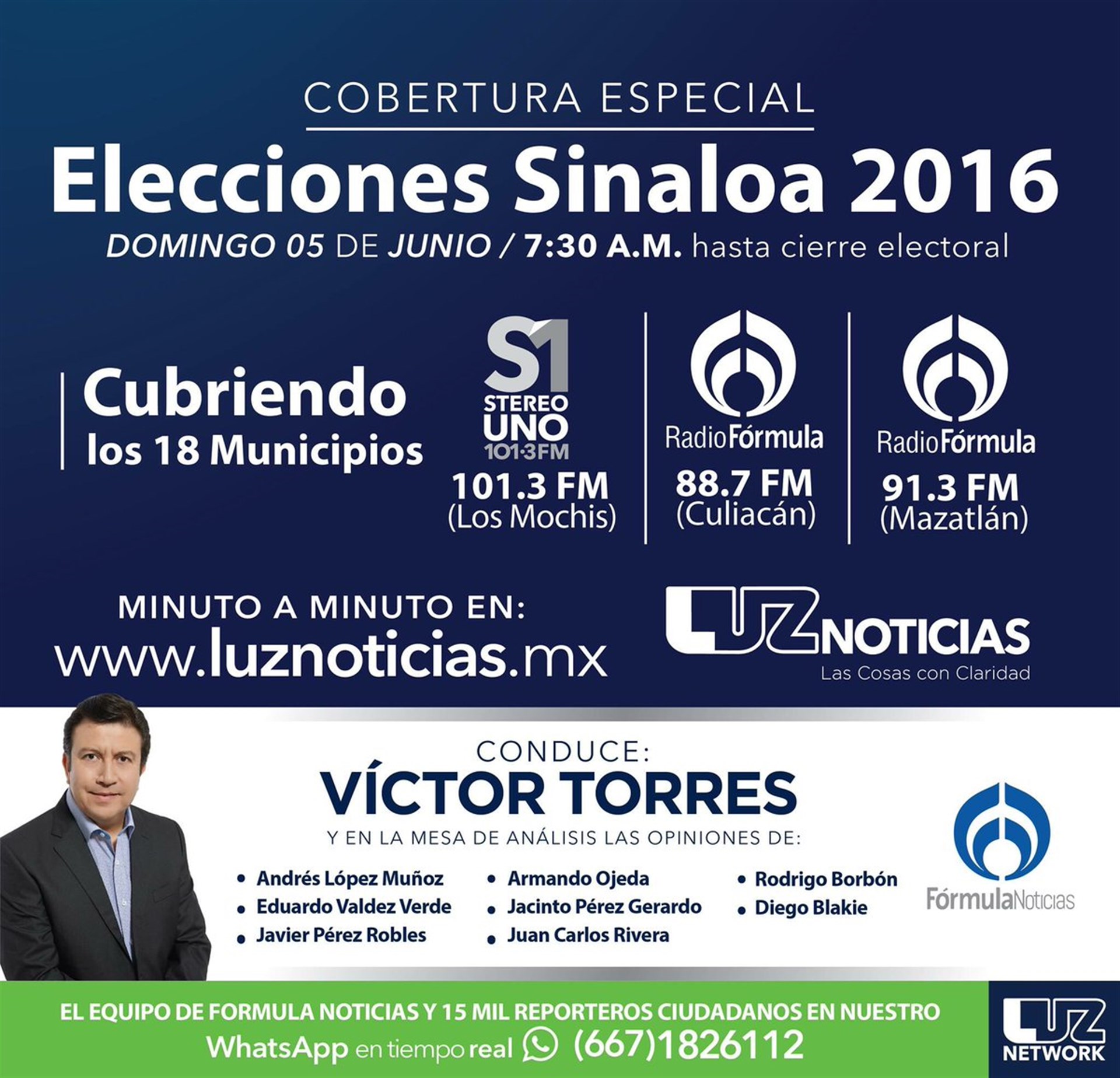 Sinaloa.- LUZ NOTICIAS trae para usted la cobertura especial Elecciones Sinaloa 2016, este domingo 5 de junio, donde los 18 municipios de la entidad estarán enlazados a través del 101.3 de FM, en Los Mochis; 88.7 FM, en Culiacán; 91.3 FM, de Mazatlán, y minuto a minuto en www.luznoticias.mx.