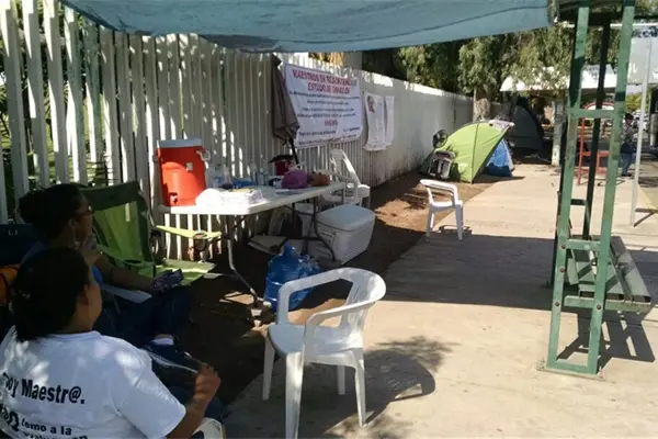 Docentes afectados por el cese continúan en plantón permanente a las afueras de la SEPyC en espera de una respuesta.