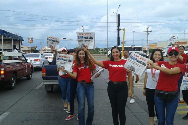 Mazatlán, Sin. - En solidaridad con la empresa con motivo del embargo aplicado por parte de SAT-Hacienda, trabajadores de Editorial Noroeste salieron a los cruceros de la ciudad a vender la edición de este jueves, que a ocho columnas dice "Embargan a Noroeste con acciones ilegales".