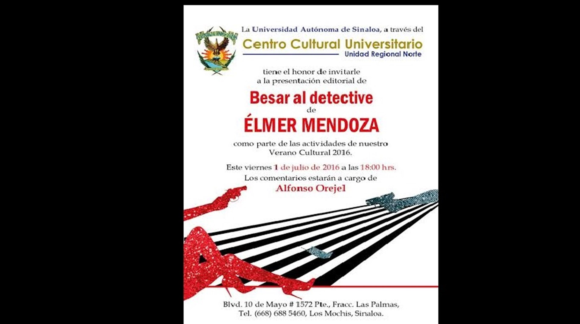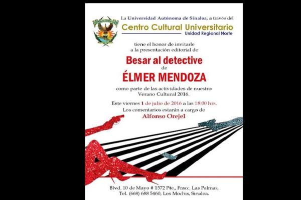 Los Mochis, Sin.- Como parte de las actividades del Verano Cultural 2016, este viernes se presentará el escritor de Culiacán, Élmer Mendoza, quien presentará su libro “Besar al detective” en la librería Jaime Labastida Ochoa del Centro Cultural Universitario de la Universidad Autónoma de Sinaloa (UAS), anunció el director de este recinto, León Cartagena.