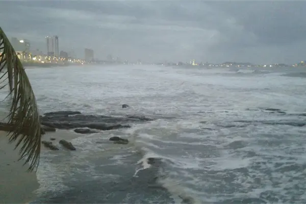 Sin embargo, los vientos han empezado a intensificarse aproximadamente a los 25 kilómetros por hora y el oleaje también crece, y apareció la lluvia en algunos sectores de la ciudad, el mar se encuentra revuelto y con fuerte marejada.