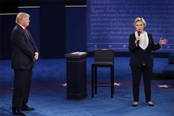Trump, quien replicó con acusaciones contra el expresidente William Clinton sobre ataques sexuales, pasó buena parte del tiempo paseando y gesticulando agresivamente en el escenario del debate, mientras Hillary hablaba.
