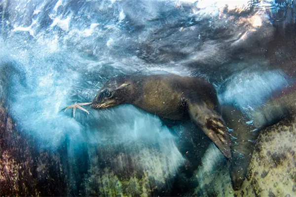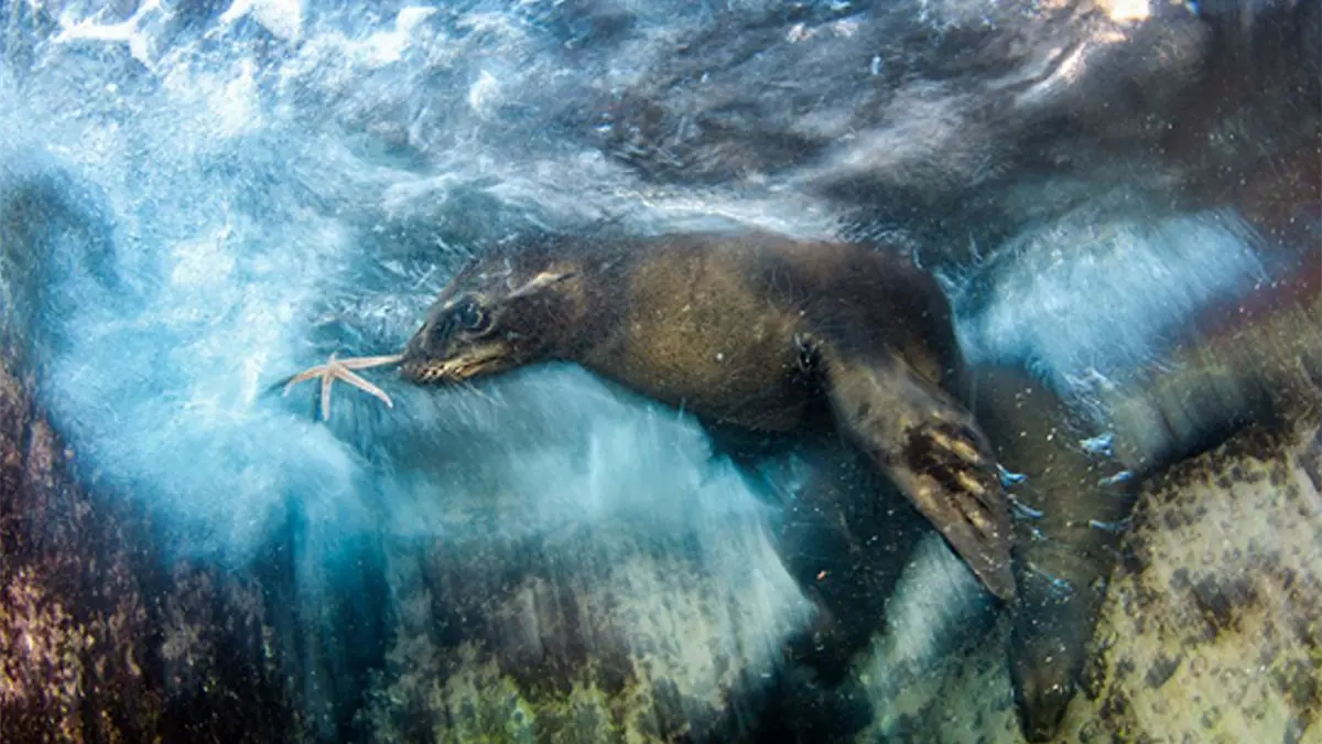 La imagen de un león marino jugando con una estrella de mar, que fue tomada en el mar de Cortés cerca de la isla Espíritu Santo, en Baja California Sur, obtuvo el primer lugar en la categoría de “Impresiones”, por retratar la naturaleza desde una perspectiva artística.