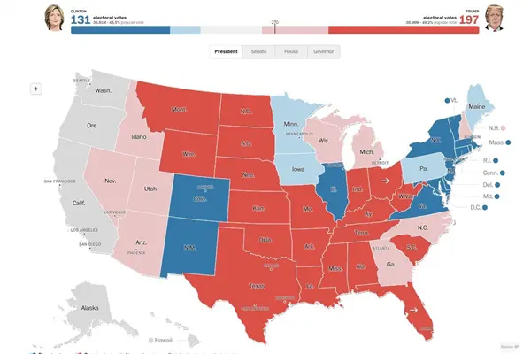 De acuerdo con proyecciones de la cadena CNN, hasta las 22:40 horas del Este estadunidense (03:40 GMT del miércoles), Trump acumulaba 167 votos electorales y Clinton 131,