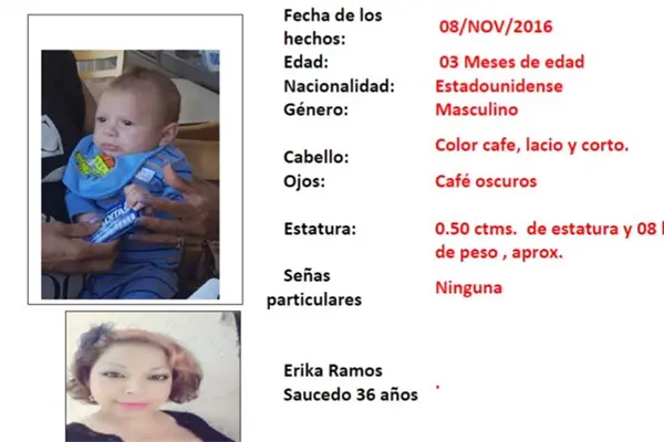 Informes de la Procuraduría General de Justicia del Estado indican que el bebé, de nombre Maximus “N”, de tres meses de edad, fue sustraído de un Centro de Custodia de la mencionada ciudad de California, a las 09:00 horas del 8 de noviembre de presente año, por su madre, Érika Ramos Saucedo, activándose el programa de Alerta Amber.