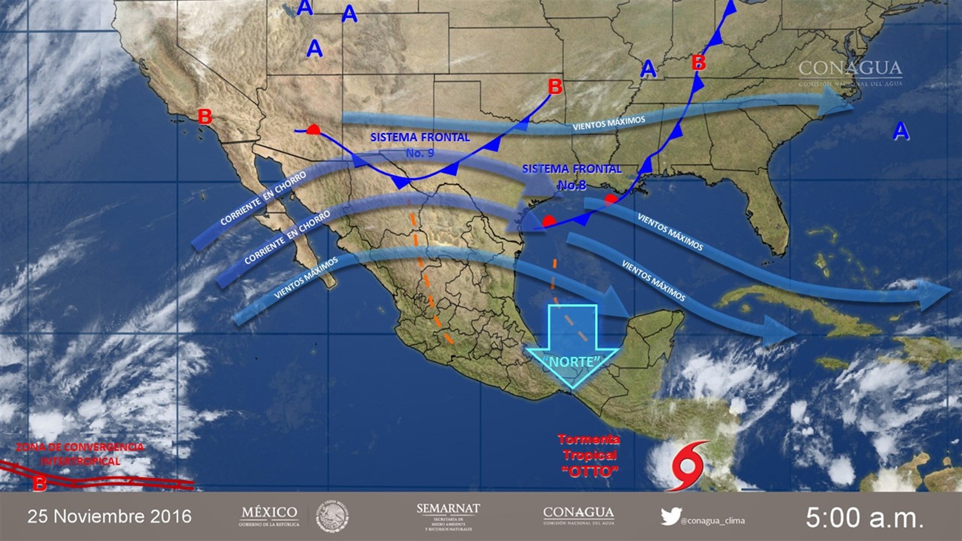 Prevé también que el ciclón tropical Otto se aproxime al Golfo de Tehuantepec, reforzando el potencial de lluvias en el sureste del territorio nacional.