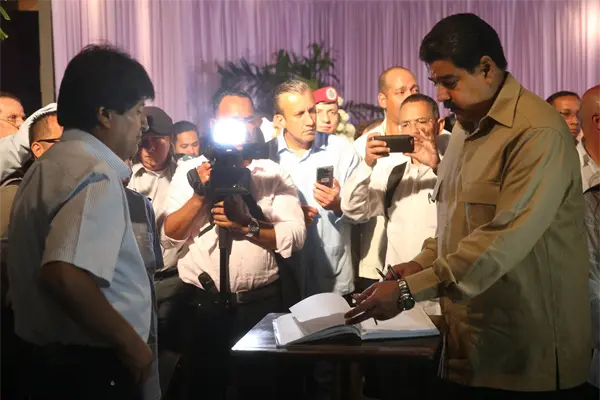 Después de manifestar su pesar con respetuoso silencio frente al retrato de Fidel Castro, Maduro y Morales firmaron el libro de condolencias abierto en ese sitio, donde miles de cubanos continúan rindiendo homenaje al líder fallecido el pasado viernes a los 90 años de edad.
