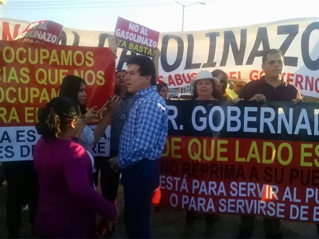ÑGuamúchil, Sin.- Durante la gira de trabajo que realizó este miércoles el Gobernador, Quirino Ordaz Coppel, en el municipio de Salvador Alvarado, un grupo de personas lo recibió con mantas y gritos por estar en contra del reciente incremento al precio de los combustibles y en su llegada pedían los atendiera e hiciera caso al pueblo.