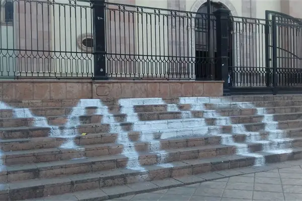 “Cuando abrimos el templo se abren las rejas, realmente ahí no me percate que estuviera la placa en las escalinatas ya fue hasta después de salir de la misa de las 8 de la mañana que ya al dirigirme a la casa ya la Sacristina me envía la imagen y me dice padre así amaneció catedral y yo fue cuando nos dirigimos, al saber tenemos que dar parte porque es un monumento histórico no es porque solamente el hecho de que rayaron una casa, independientemente de ser de un lugar de culto es un monumento histórico y es propiedad federal (…) Pusieron las letras MAD, el que significa, unos puede sacar conjeturas por su significado en inglés pero no me atrevería yo a decir a significa esto”, dijo.