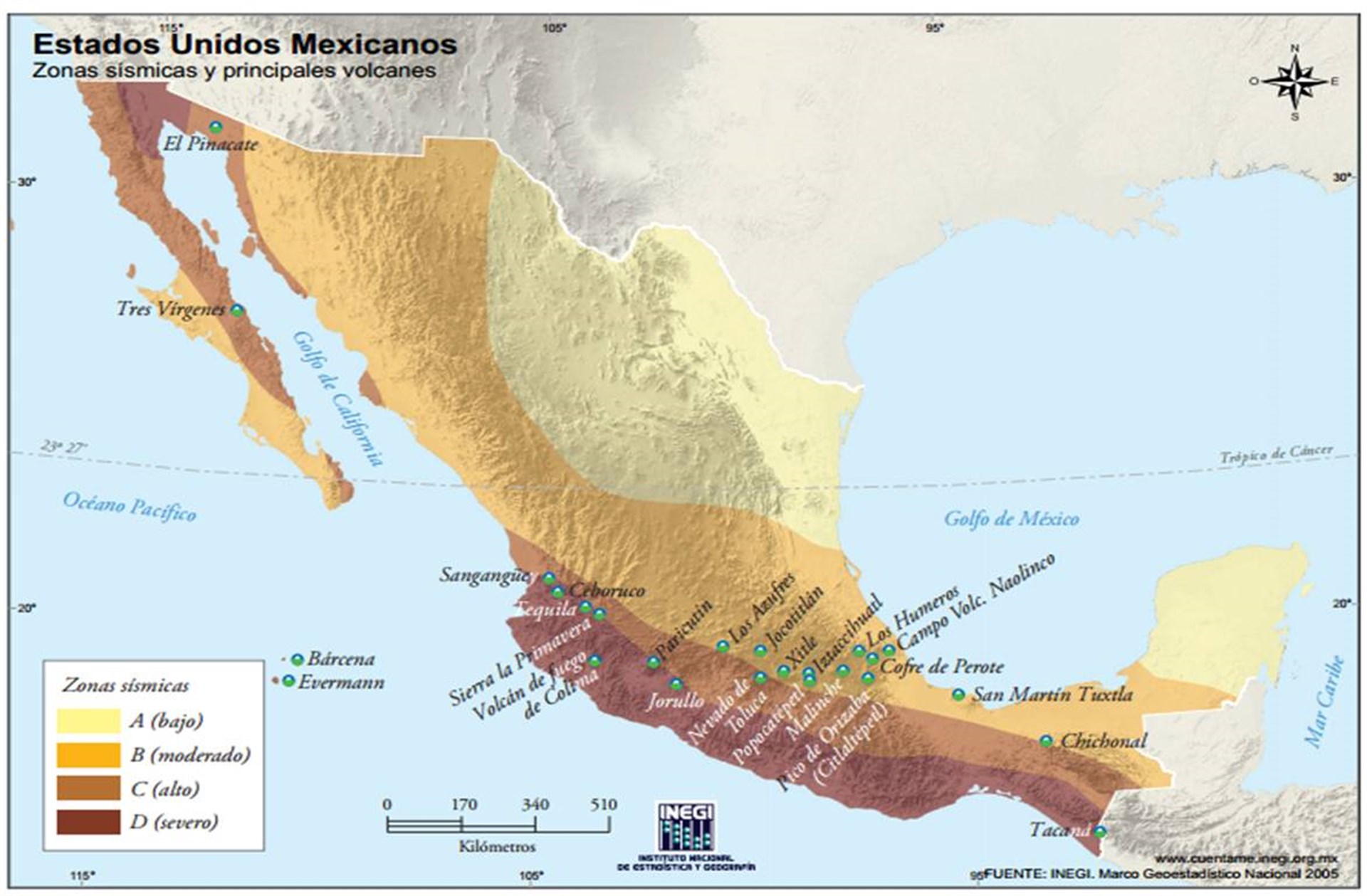 Las zonas de mayor sismicidad se concentran en la costa occidental del país a lo largo de los bordes de varias placas cuyo contacto es conocido como Trinchera.