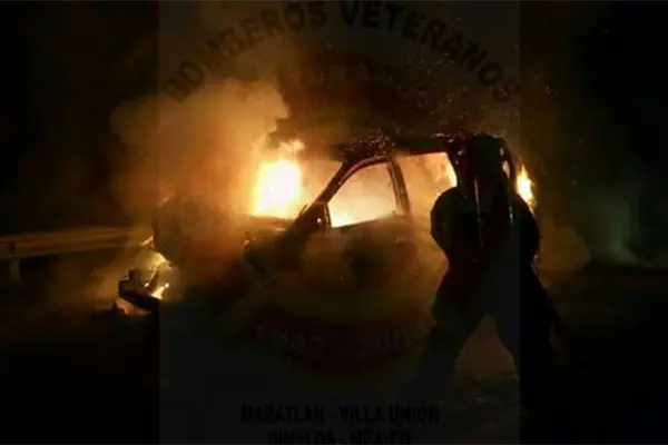 Mazatlán, Sin.- Una camioneta cerrada chocó contra un semoviente y terminó por incendiarse en plena carretera Internacional al sur cerca de la sindicatura de Villa Unión.