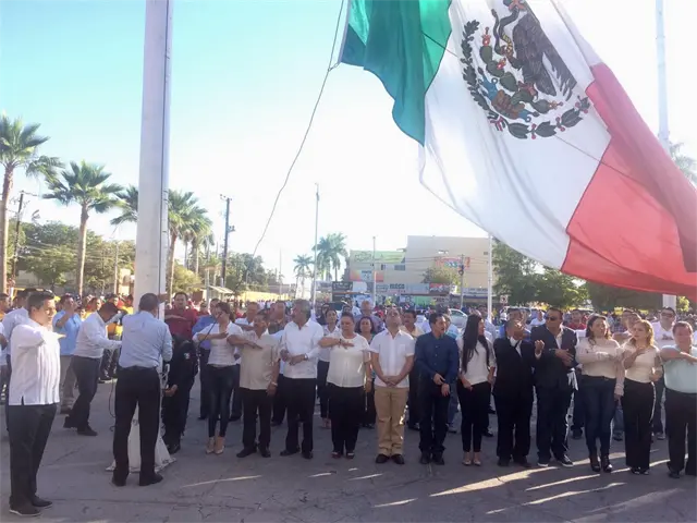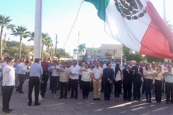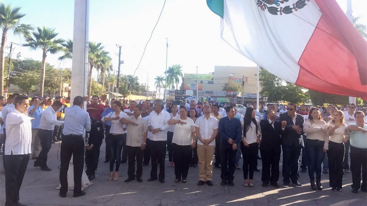 Los Mochis, Sin.- Con motivo del Día del Trabajo, en Ahome, hace unos momentos autoridades municipales y estatales izaron bandera e hicieron los respectivos honores a la enseña patria en la explanada de Palacio Municipal.