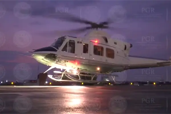 El presunto narcotraficante, escoltado por elementos de la AIC, fue subido a un helicóptero Bell de la PGR con matrícula XCJ BY.