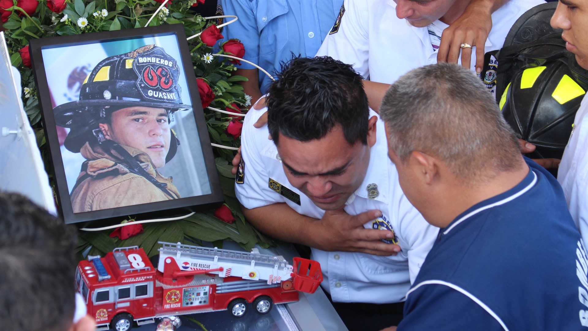 Por espacio de casi tres horas, sus compañeros pasaban a despedirse, incluso le reclamaban por qué se había adelantado, por qué se había ido si tenía muchos planes por hacer; al mismo tiempo, colocaban el número 08 sobre el cristal del ataúd, número asignado en la institución, así como un carro de bombero en miniatura.