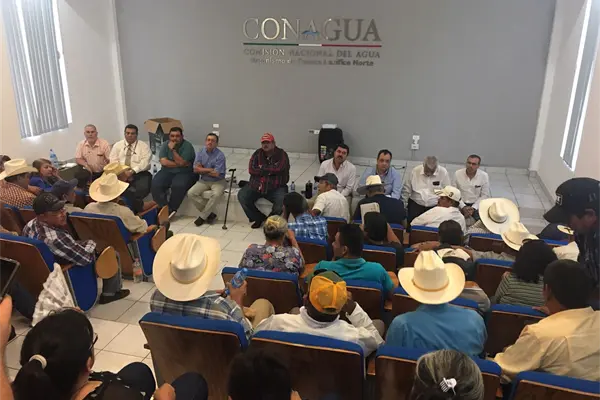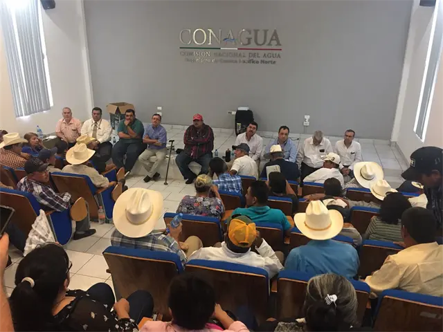 Culiacán, Sin.- En respaldo a Abdón Martha Palafox, presidente de la Unidad de Riego de los Cinco Ejidos, demandantes de agua del ejido Tres Garantías acudieron a una reunión con autoridades de la Comisión Nacional del Agua en Culiacán en donde de nuevo externaron su inconformidad en contra de los amparos interpuestos por los módulos del riego de los distritos 075 y 076 del norte de Sinaloa, contra el levantamiento de la veda y nuevas concesiones del Río Fuerte.