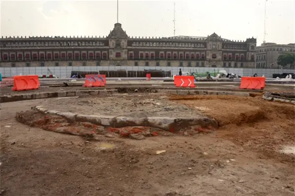 A través de la supervisión arqueológica del proyecto de rehabilitación de la Plaza de la Constitución, el equipo de la Dirección de Salvamento Arqueológico (DSA) del INAH detectó el basamento de ocho metros de diámetro y 28 centímetros de altura, rodeada por un patio circular de tres metros de ancho, al norte del asta bandera.
