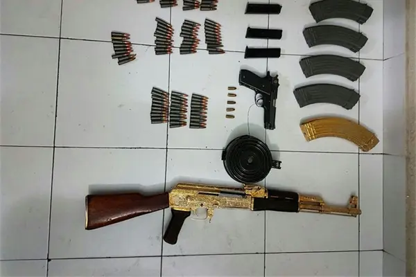 Según informes al revisar el contenido del la bolsa encontraron el armamento: un fusil AK-47 chapeado en oro, una pistola escuadra calibre .9 milímetros, 5 cargadores para fusil AK-47, 1 cargador de disco, 109 cartuchos calibre 7.62 y 5 cartuchos calibre 9 mm.