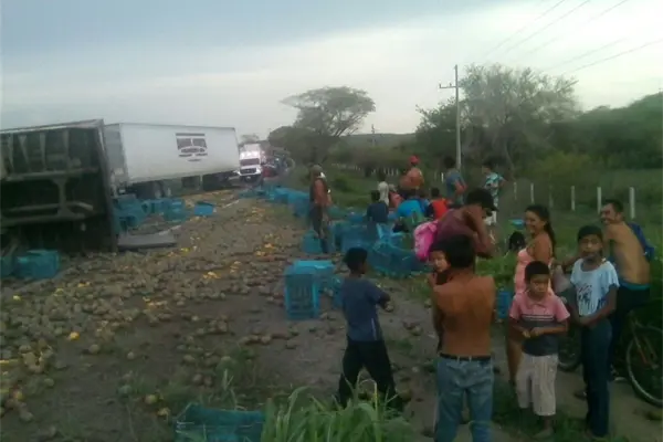 Vuelca tráiler con toneladas de mango; el chofer resulta lesionado