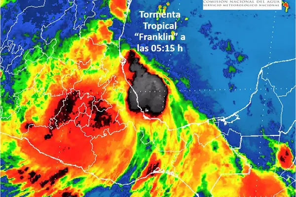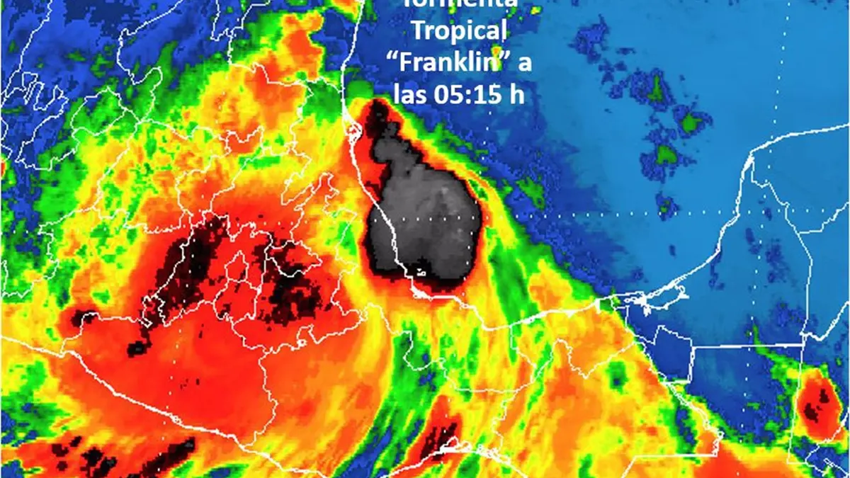 Ciudad de México. - En las primeras horas del día, ya en tierra, el huracán Franklin se degradó a tormenta tropical, no obstante, se prevé que ocasione tormentas torrenciales durante las próximas horas en San Luis Potosí, Querétaro, Hidalgo, Puebla, Veracruz, Guerrero, Michoacán y Colima; tormentas intensas en Tlaxcala, Estado de México, Guanajuato, Jalisco y Nayarit; muy fuertes en Tabasco, Chiapas, Oaxaca, Morelos y la Ciudad de México, y fuertes en Aguascalientes, Zacatecas y el sur de Durango y Sinaloa, informó el Servicio Meteorológico Nacional (SMN), dependiente de la Comisión Nacional del Agua (Conagua).