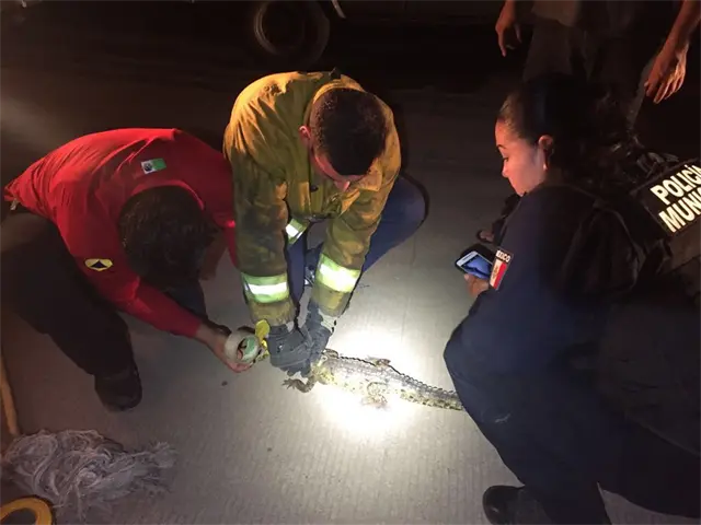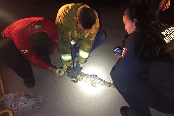Personal de Protección Civil Municipal, junto con bomberos acudieron al lugar y ubicaron el pequeño caimán en la cochera de un domicilio por la citada calle entre Coníferas y Sabana.