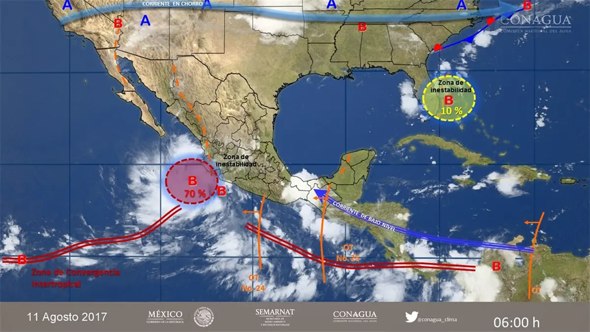 Las condiciones mencionadas son debido a la zona de baja presión remanente de Franklin, que tiene 90% de posibilidad de desarrollo ciclónico y se localiza frente a las costas de Jalisco y Colima, así como por las ondas tropicales números 24 y 25, ubicadas al sur de Guerrero y al oriente del Golfo de México, respectivamente.