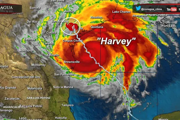 Para el martes o miércoles, "Harvey" entraría al Golfo de México como tormenta tropical rumbo al este, en la ciudad de Houston, Texas, la tercera ciudad más importante de Texas, que sería azotada por una tormenta tropical.