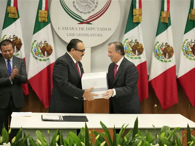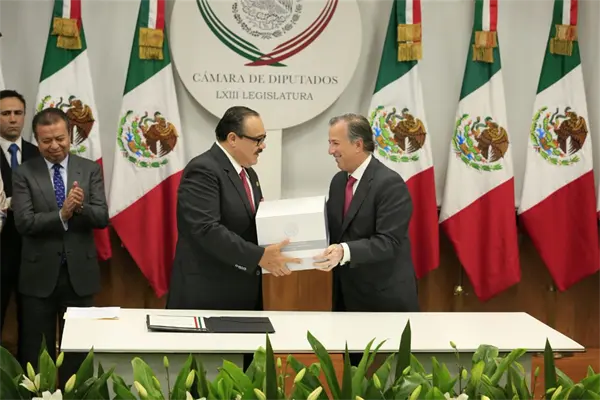 El presidente de la Mesa Directiva de la Cámara de Diputados, Jorge Carlos Ramírez Marín recibió del secretario de Hacienda, José Antonio Meade, el paquete económico para el ejercicio fiscal 2018, que será estudiado y, en su caso, aprobado.