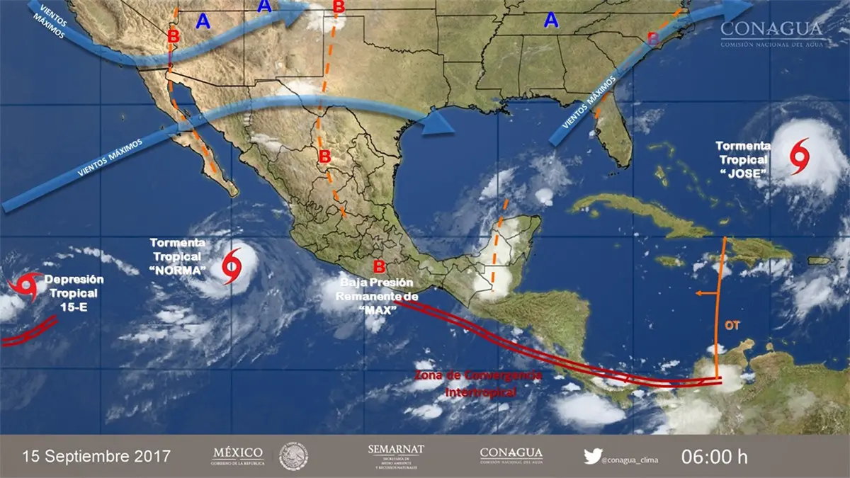 Indicó que dichos sistemas ocasionarán tormentas intensas en zonas de Guerrero y Oaxaca, y tormentas muy fuertes en regiones de Baja California Sur, Nayarit, Jalisco, Colima, Michoacán, Puebla, Veracruz, Chiapas y Tabasco.