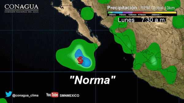 En el aviso más reciente emitido por el organismo dependiente de la Comisión Nacional del Agua (Conagua) indicó que Norma se ubica a 230 kilómetros al suroeste de Cabo San Lucas, Baja California Sur.