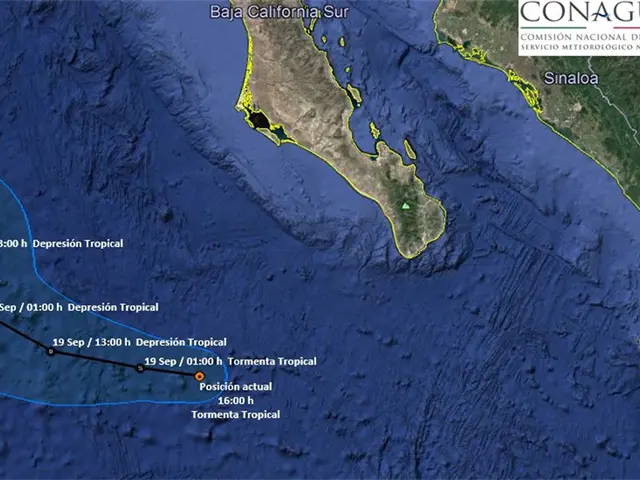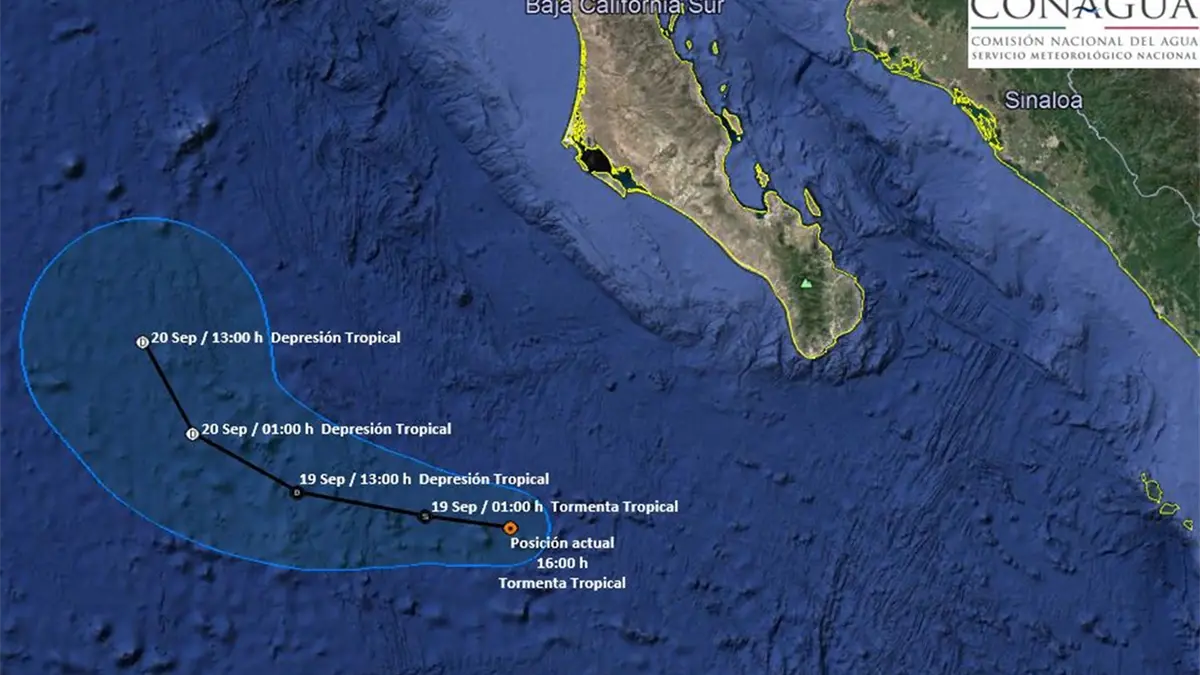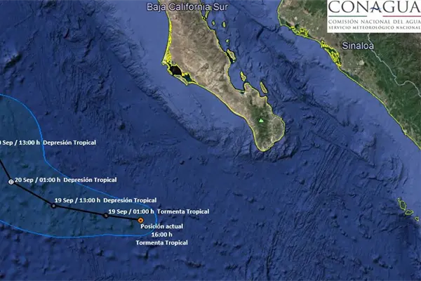 Se ubica a 340 km al oeste-suroeste de Cabo San Lucas, BCS, se desplaza al oeste (270°) a 9 km/h