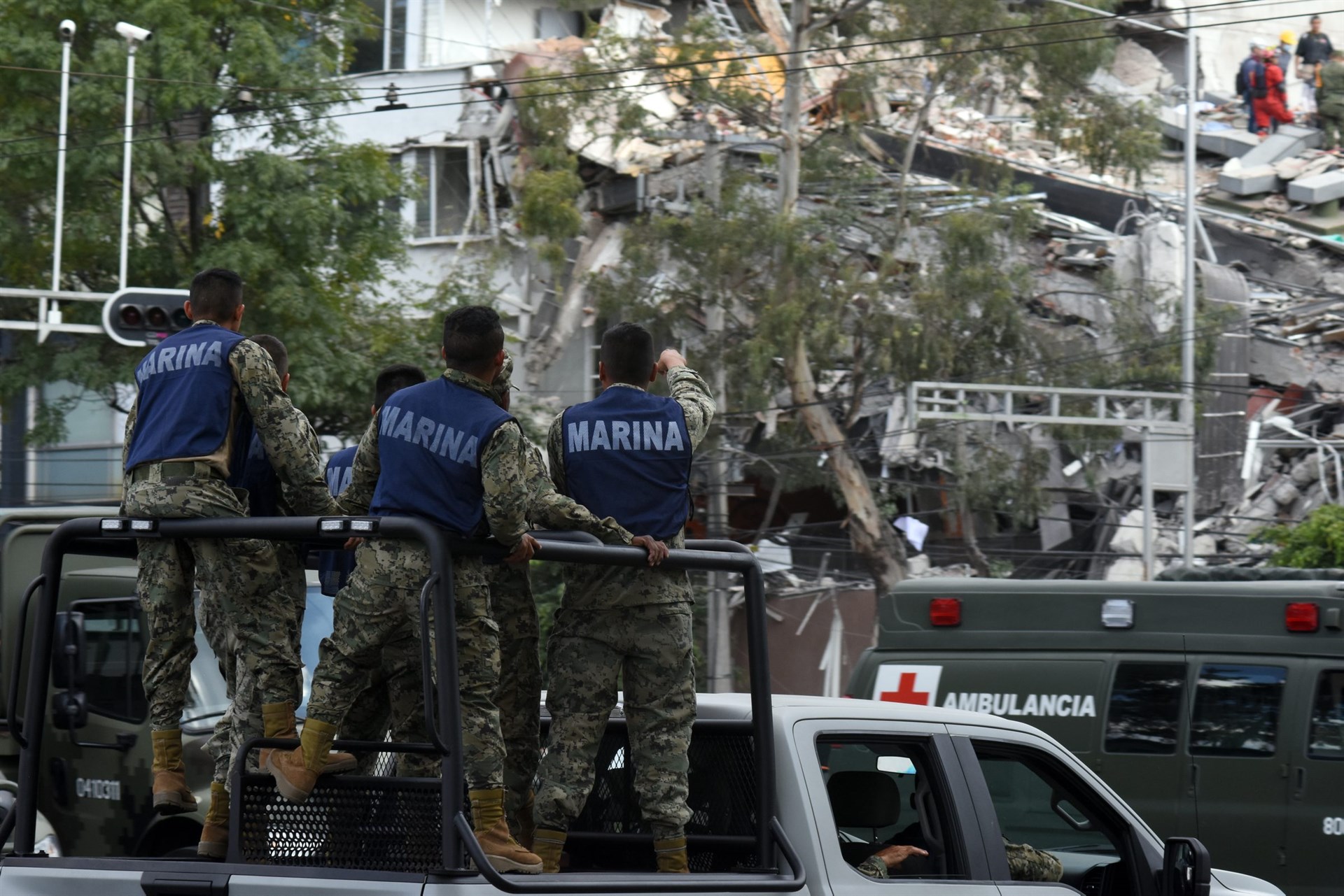 Luego de referir que se ha registrado el colapso de 45 lugares en la capital del país, destacó que durante la madrugada elementos de la Policía Federal, del Ejército, y la Marina, además de los voluntarios se han incorporado al trabajo y aseguró que "no van a parar hasta rescatar y encontrar a las personas que se supone puedan estar entre los escombros".