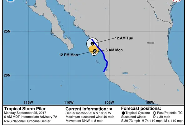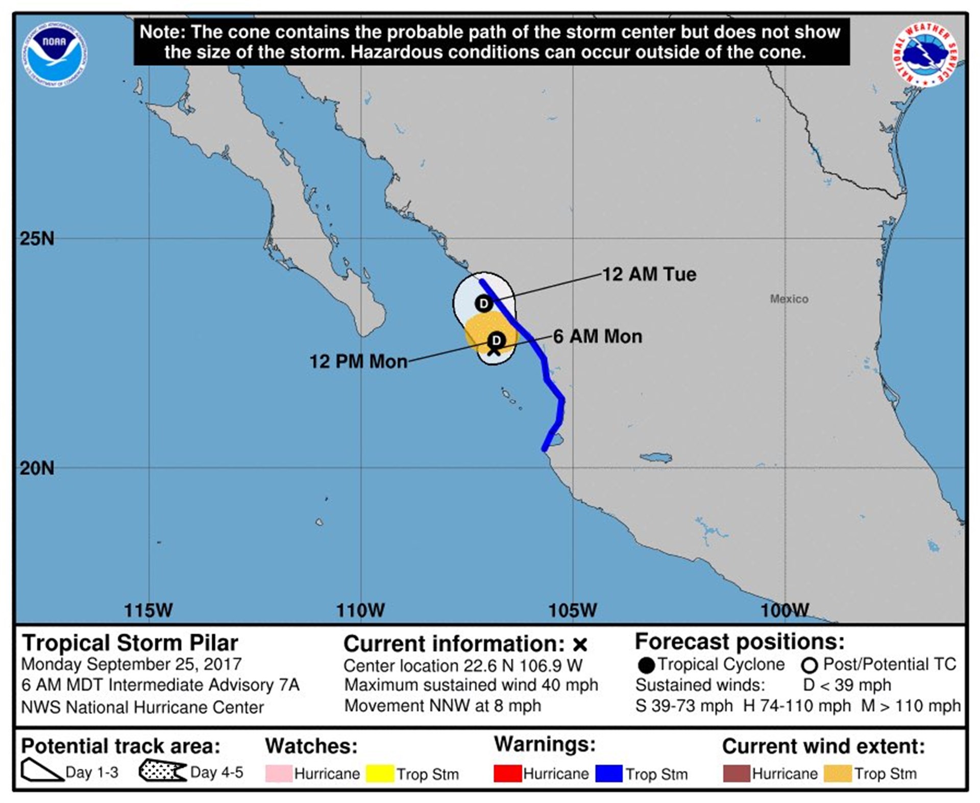 tropical Pilar se localizó aproximadamente a 85 kilómetros (km) al suroeste de Mazatlán Sinaloa, con vientos máximos sostenidos de 65 km/h, rachas de 85 km/h y desplazamiento al nor-noroeste a 13 km/h.