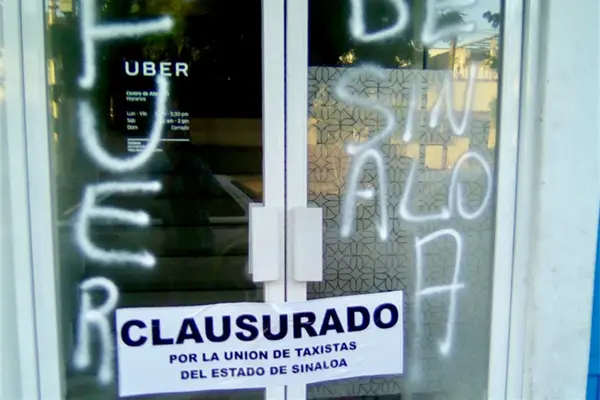 Culiacán, Sin.- No tiene ni 15 días de que la plataforma UBER abriera sus oficinas físicas por la calle Francisco Zarco, en la colonia Guadalupe, cuando la puerta de acceso fue rayada con pintura en aerosol con la leyenda: “Fuera de Sinaloa”.