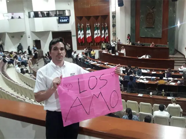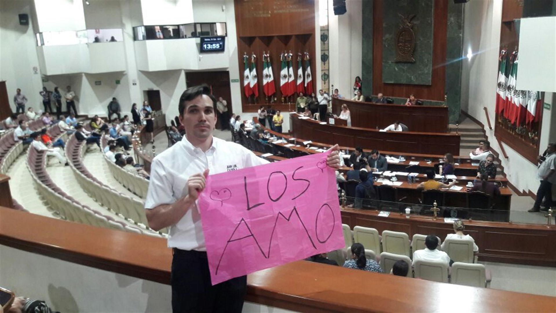 Culiacán, Sin.- Debido a que en varias ocasiones se ha impedido el acceso de cartulinas a los manifestantes que acuden al Congreso, en esta ocasión el ciudadano Luis Gaxiola Félix acudió con una hoja de papel china con el mensaje de "Los Amo".