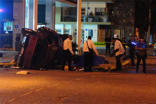 Tras el fuerte impacto, la camioneta Explorer tinto chocó contra un semáforo y lo tumbó, después volcó; y el Golf blanco quedó varios metros más adelante.