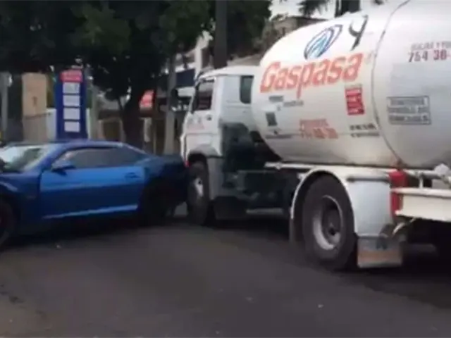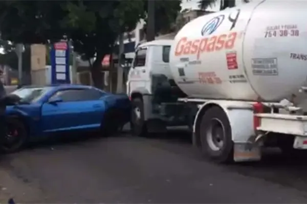 Fue minutos después de las siete de la mañana que se registró un choque múltiple entre un Chevrolet Camaro, color azul, de modelo reciente, una Nissan Urban, color blanco, y un camión expendedor de gas estacionario.