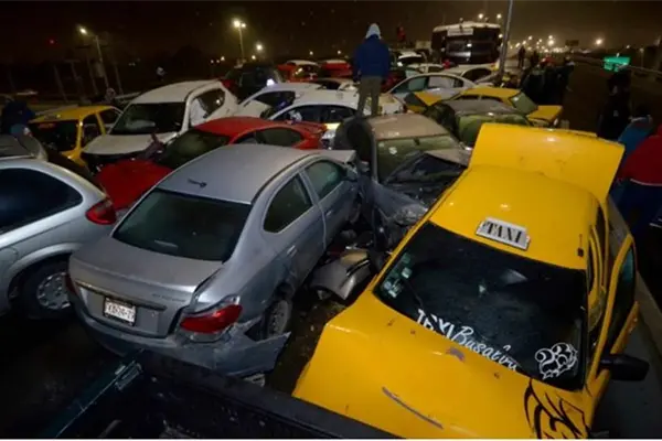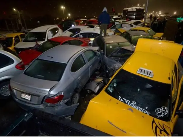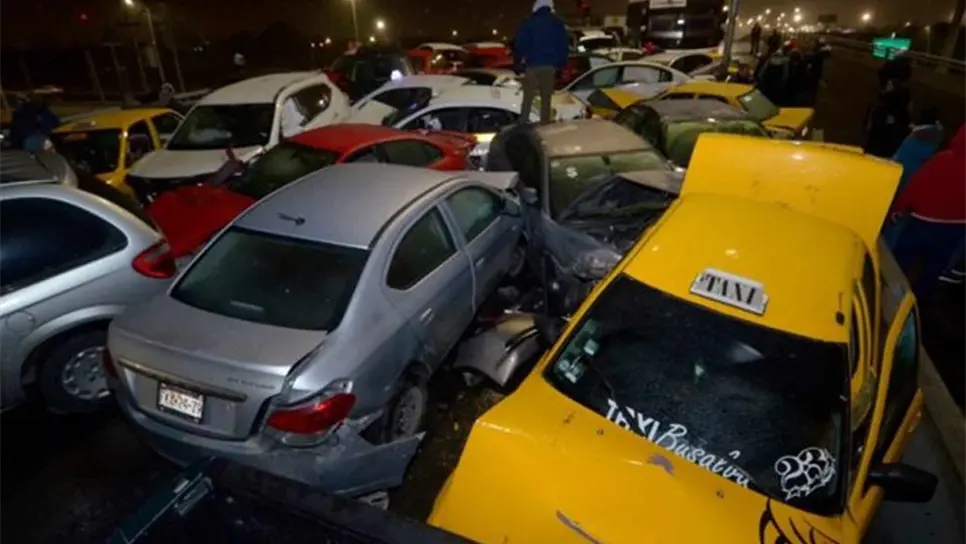 Ciudad de México.- Una capa de hielo en la carpeta asfáltica y llovizna provocó una carambola de 40 vehículos en la carretera Periférico Luis Echeverría y Nazario Ortiz Garza, en Saltillo Coahuila.