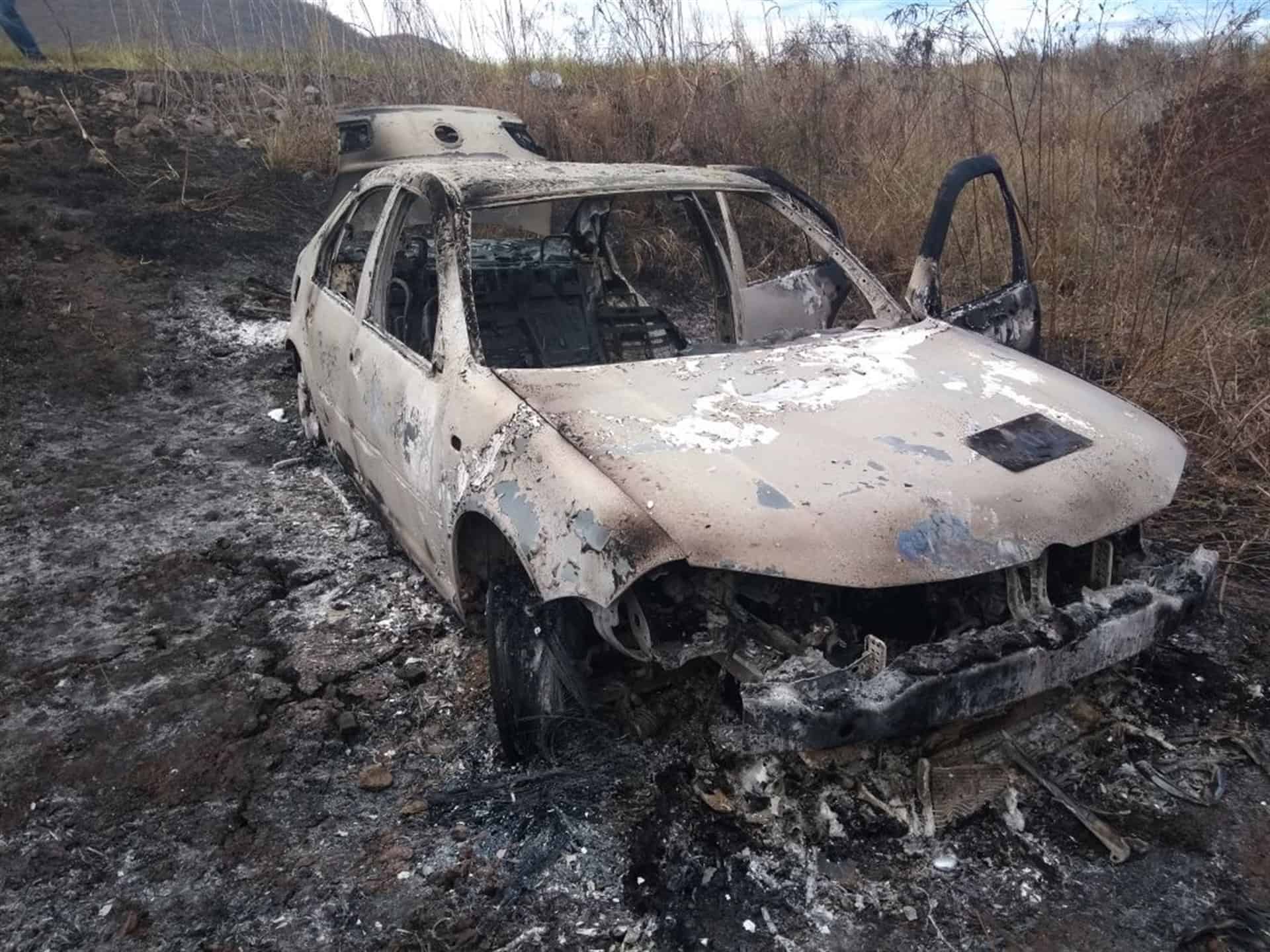 Se trata de un automóvil volkswagen Jetta, color gris, modelo 2012, con placas VSV1129 del estado de Sinaloa, el cual fue encontrado a la altura del kilómetro 88+500 por la carretera Internacional México 15, en las inmediaciones de la comunidad de Aguapepe, mismo que presentaba tres impactos de bala al parecer de arma AK-47, de los llamados “cuerno de chivo”, en las puertas traseras, además, totalmente incendiado.