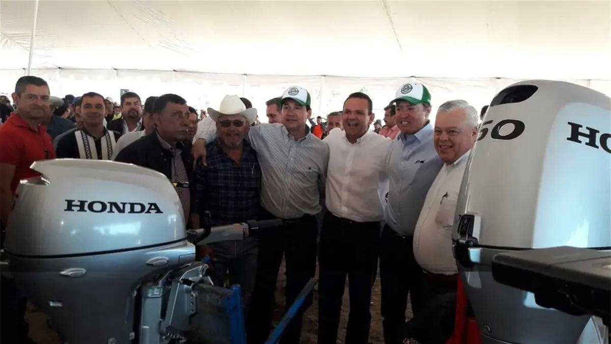 El Huitussi , Guasave, Sin.- Con una inversión de 67 millones de pesos, entre la Federación y el Estado de Sinaloa, al mediodía de este jueves, en el Campo Pesquero El Huitussi, el Gobernador de Sinaloa, Quirino Ordaz Coppel, y el Comisionado de Conapesca, Mario Aguilar Sánchez, iniciaron con la entrega de motores y pangas a pescadores.