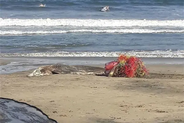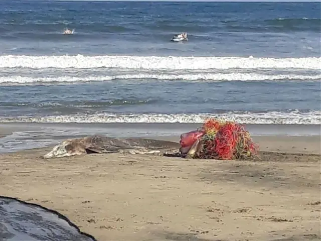 Las autoridades encontraron la cola del animal enredada en una red tipo chinchorro, anzuelos insertados en el exterior de su trompa, así como la falta de varias piezas dentales y múltiples cortes en la piel.