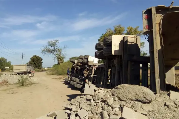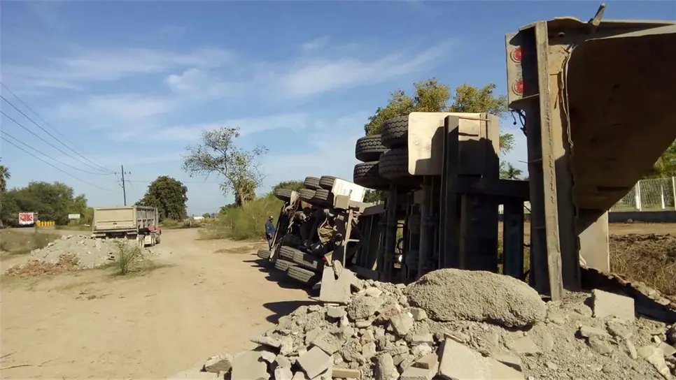 Según informes, el conductor de la pesada unidad, se encontraba descargando el escombro (pedacería de block), cuando el hidráulico que levanta el remolque falló, lo que causó que se ladeara por el peso hacia un costado, tirando el material.