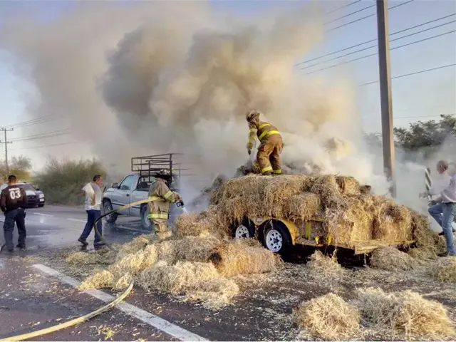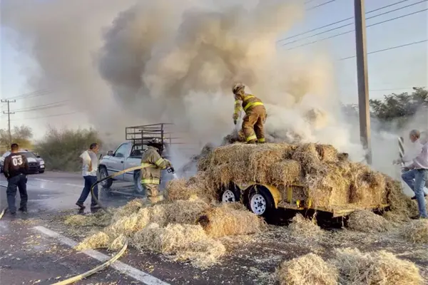 Se trata de una camioneta RAM, color gris, con placas de Sinaloa, que jalaba un remolque o cama baja, en la que transportaban decenas de pacas de frijol, cuando se registró un corto en el cableado del "jalón", lo que provocó el incendio.