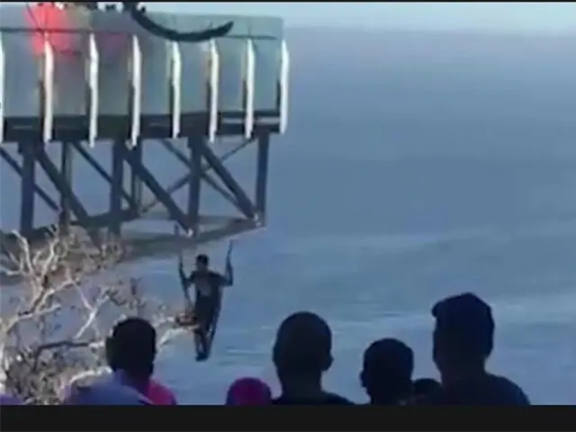 Un joven se columpió sobre una hamaca en el puente volado de cristal.