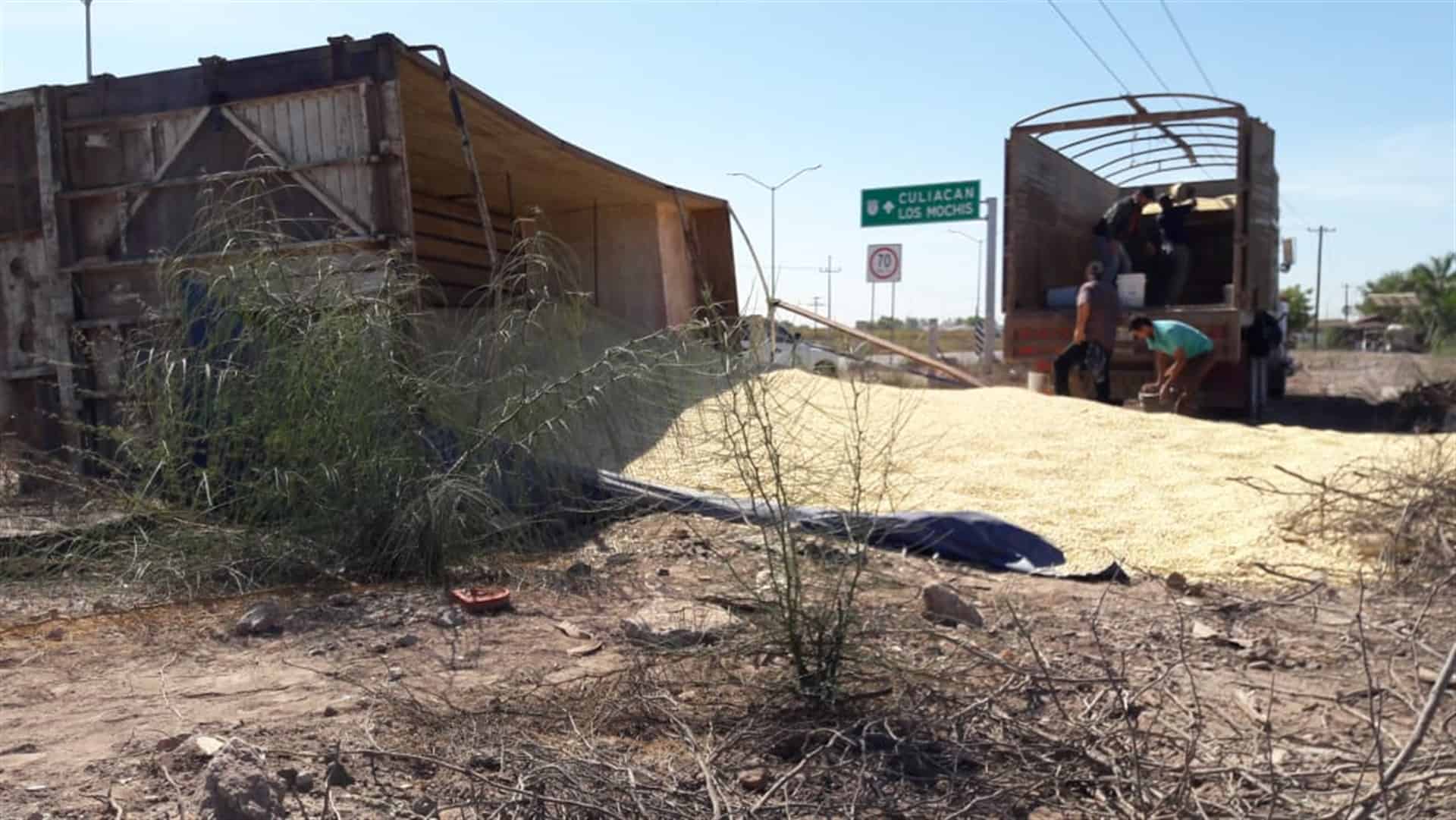 Los Mochis, Sin.- Un camión cargado con 15 toneladas de maíz, volcó esta mañana cuando circulaba por la Carretera Federal México 15, en la salida norte de Los Mochis; afortunadamente el chofer resultó ileso.