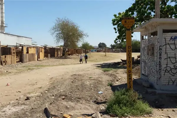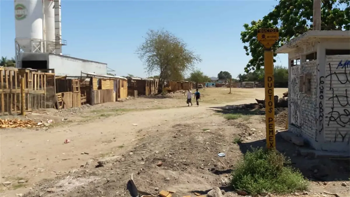 Las viviendas de madera han sido construidas pese a la presencia de anuncios de peligro de no golpear, no cavar por ductos bajo tierra de combustóleo y diésel de Pemex.