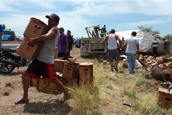 Los Mochis, Sin.- Lo que para una empresa representó pérdidas por varios miles de pesos, tras volcarse un tráiler con doble semirremolque cargado con cerveza, para otros fue la oportunidad de llegar a la rapiña de bebidas embriagantes.